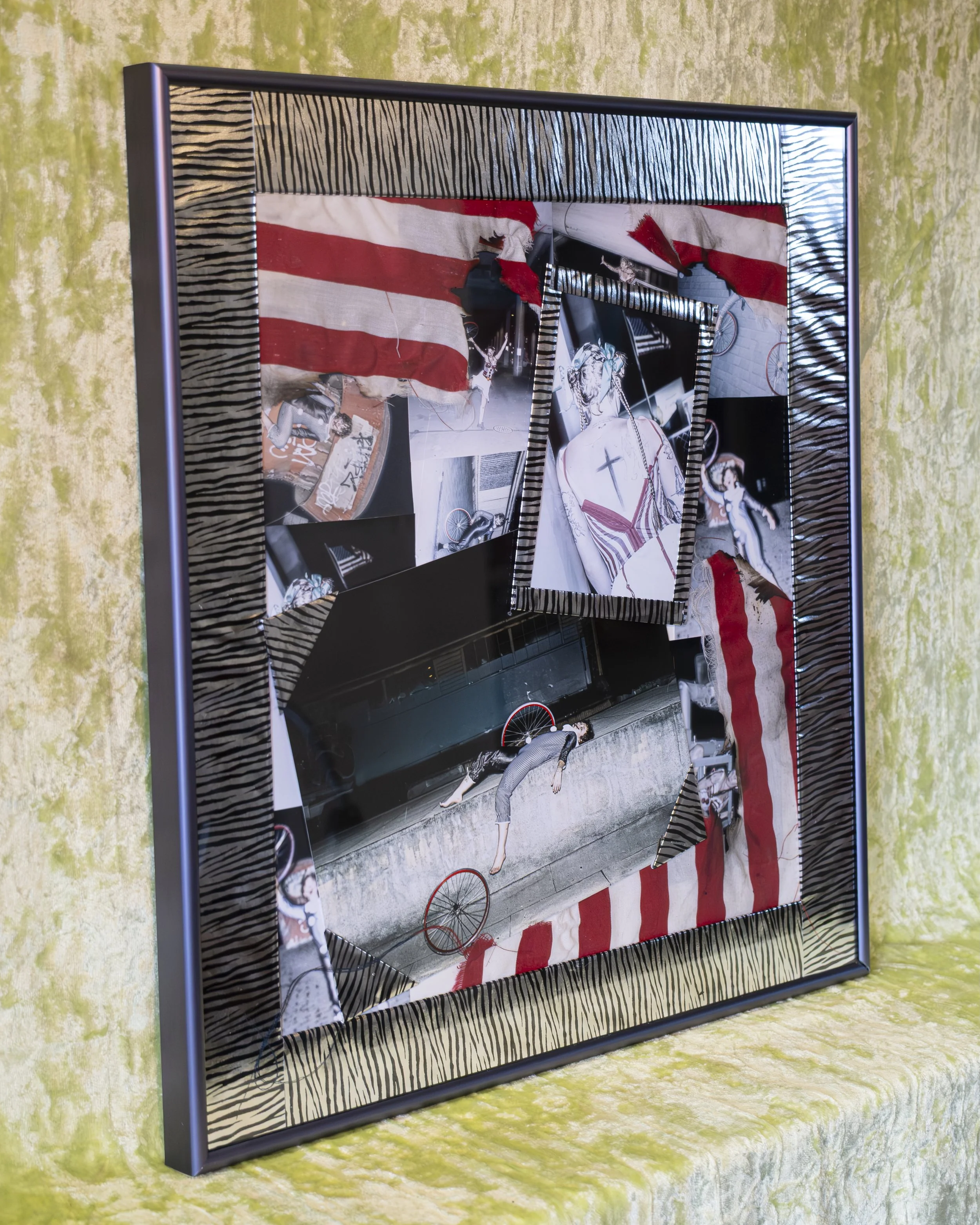 [ Digital photo prints, metallic wrapping paper, burnt + ripped American flag, found vintage frame ]